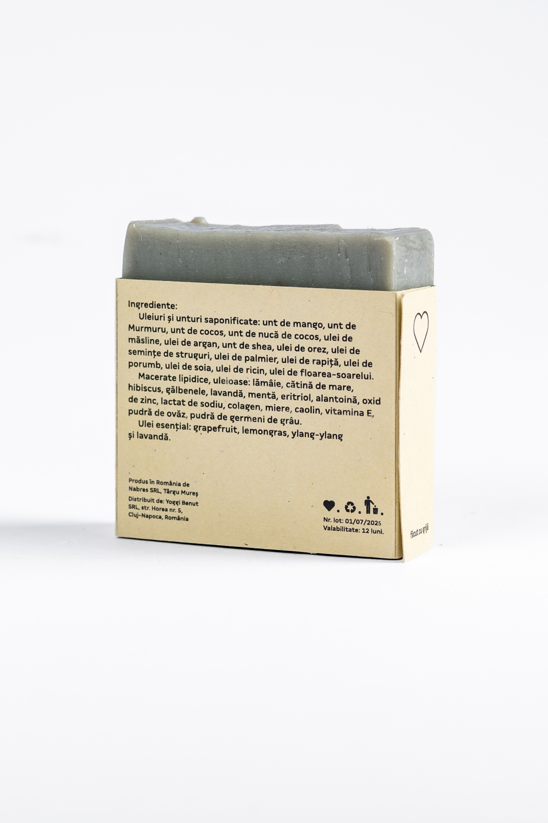 Macerate lipidice, uleioase: lămâie, cătină de mare, hibiscus, gălbenele, lavandă, mentă, eritriol, alantoină, oxid de zinc, lactat de sodiu, colagen, miere, caolin, vitamina E, pudră de ovăz, pudră de germeni de grâu
